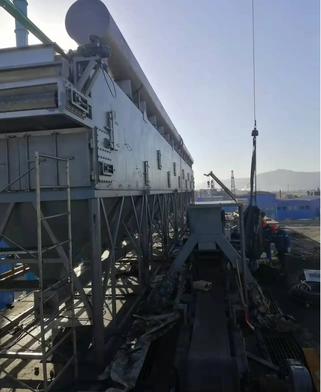 安装调试完成64米3层不锈钢板带式干燥机组,每小时8-10吨产量,稳定生产